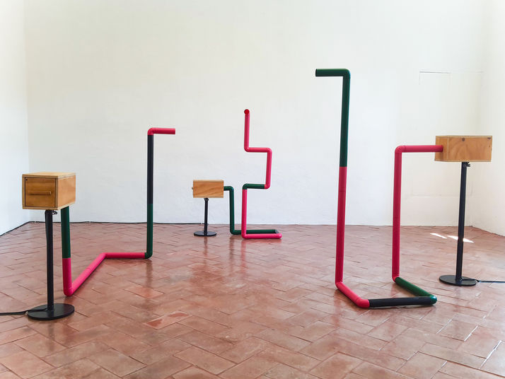 2022. Piece composed of electronic circuits, audio players, and motion-activated sensors. Each tube emits different sounds from the city of San Miguel de Allende, along with narrations about the Centro Cultural El Nigromante.